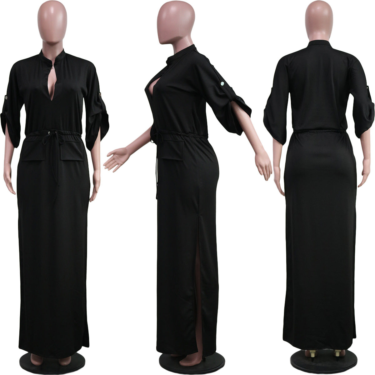 • Load image into Gallery viewer, Fashion stand collar split solid color dress(AY2430)