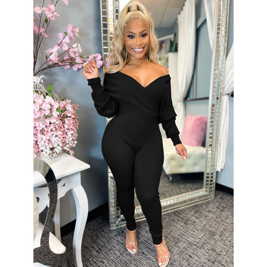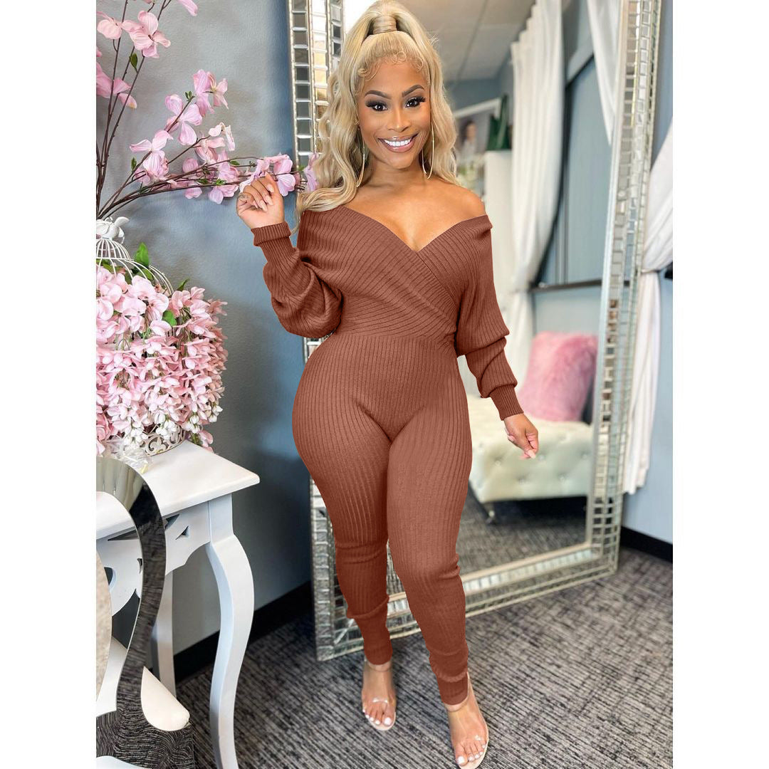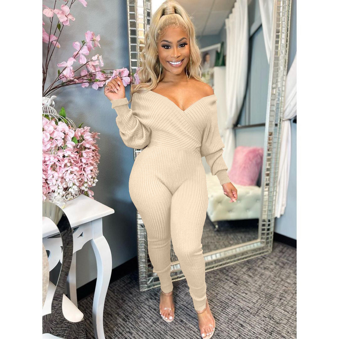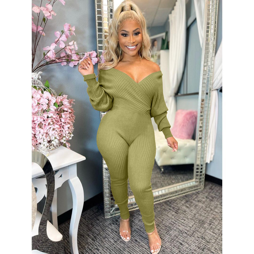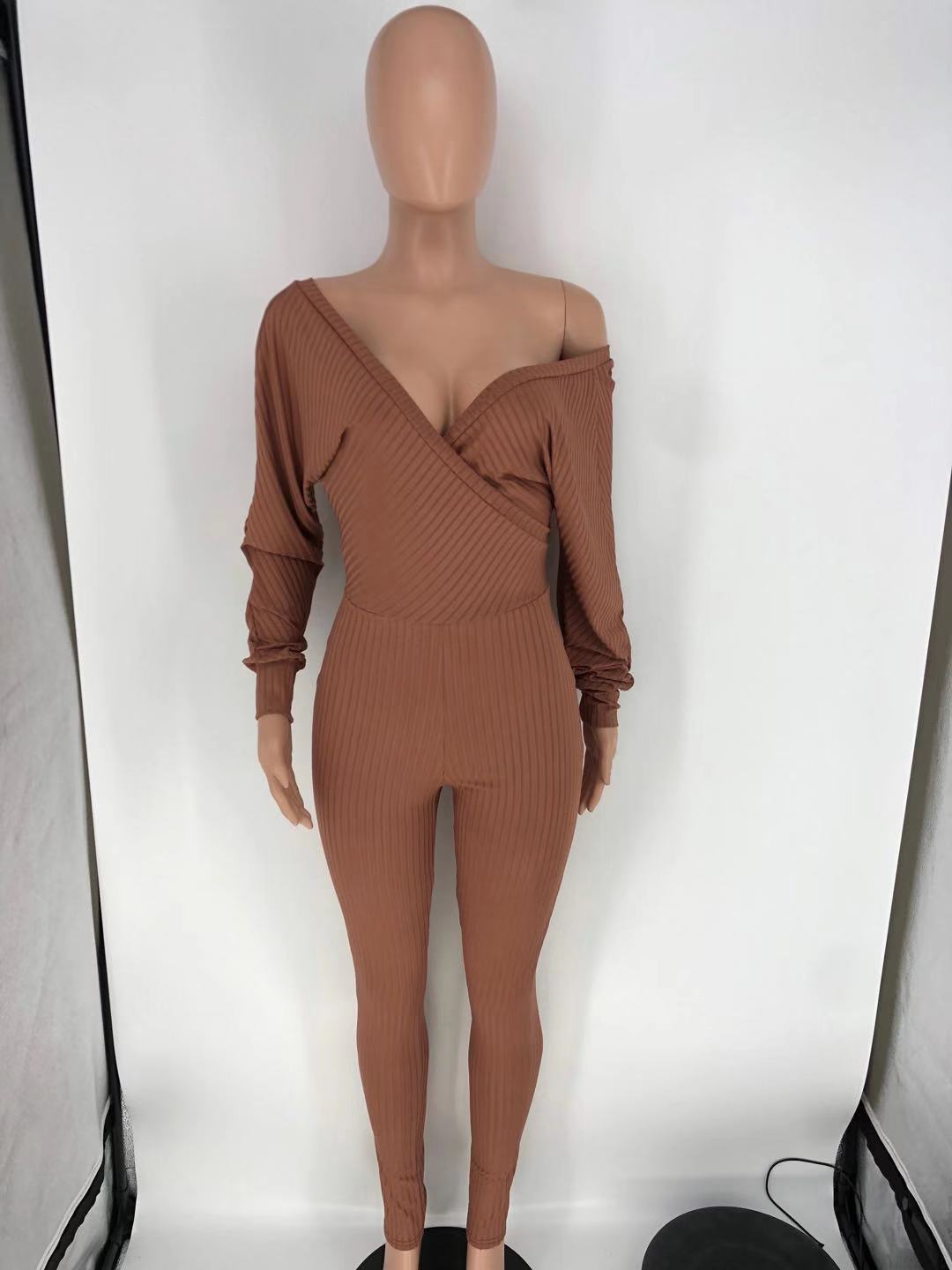 Solid color V-neck jumpsuit (AY1600)