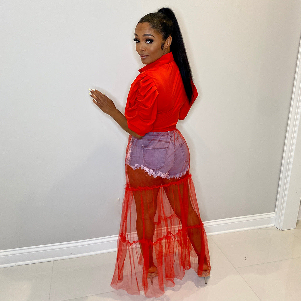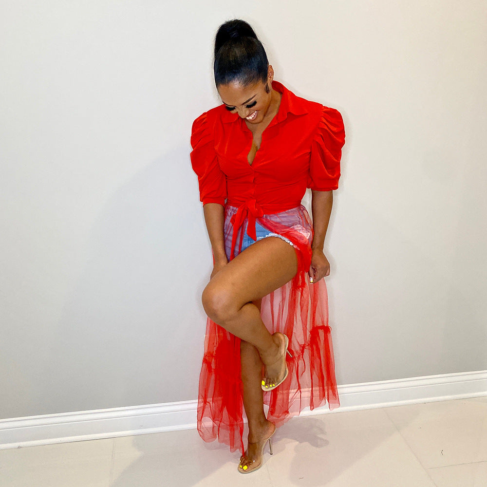 Lapel Short Sleeve Shirt Mesh Panel Dress(AY2289)