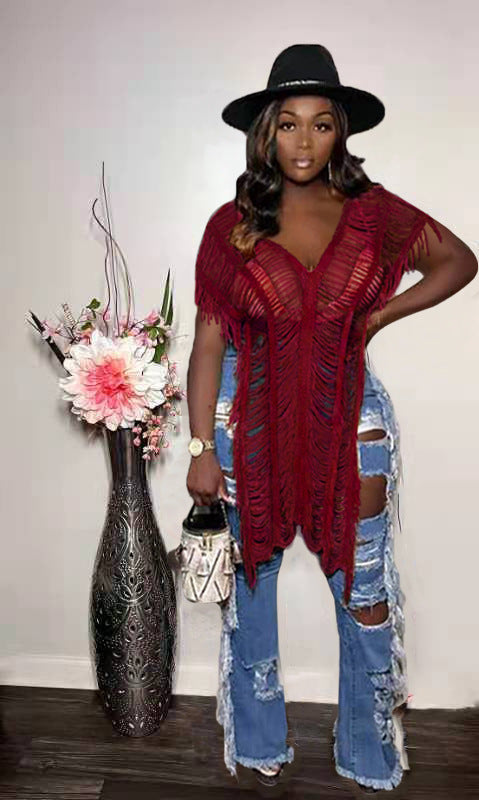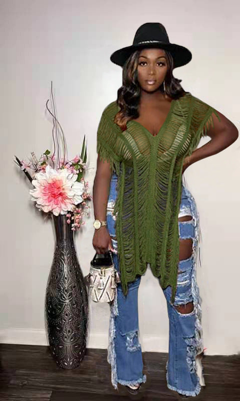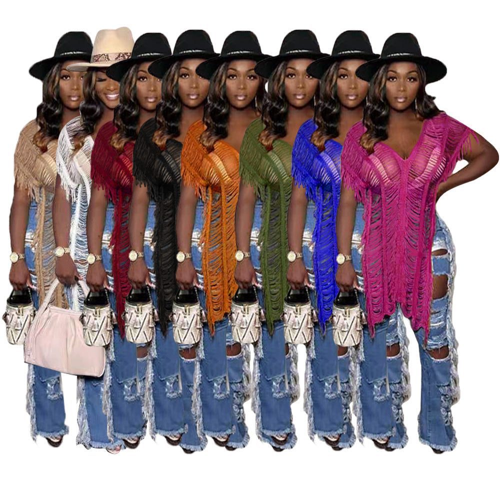 • Load image into Gallery viewer, Solid casual tassel hollowed out T-shirt AY1935