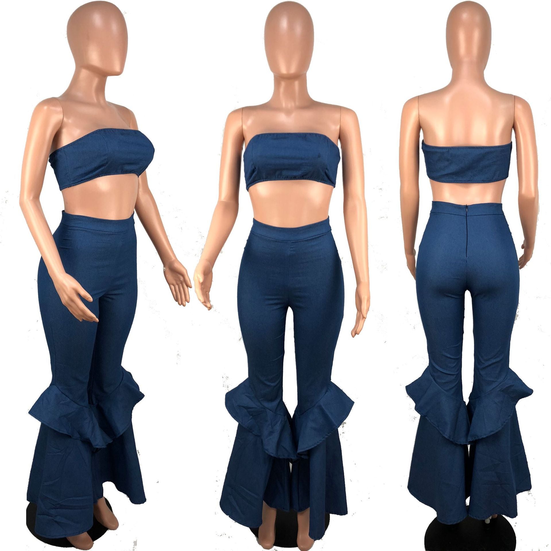 • Load image into Gallery viewer, Denim tube top flared pants set(AY2219)