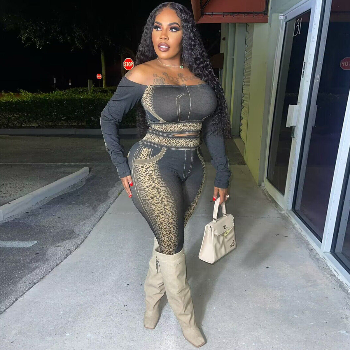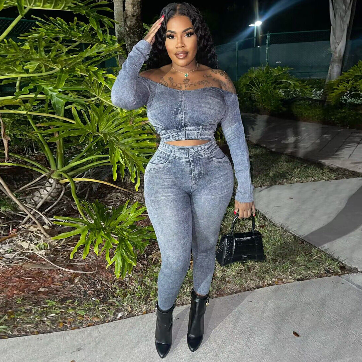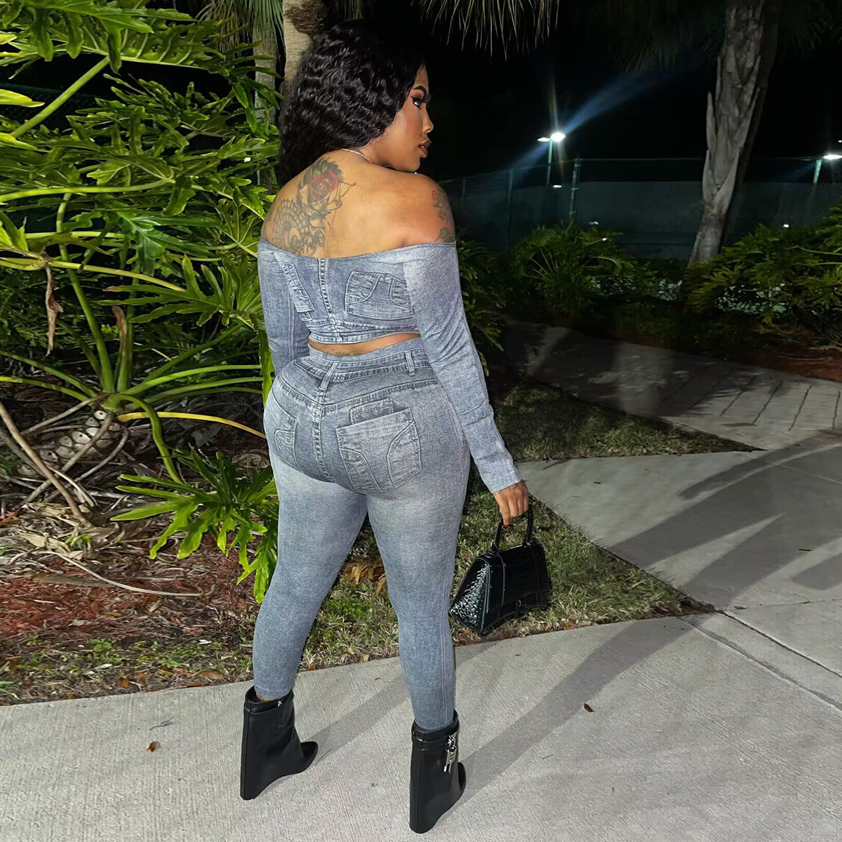 • Load image into Gallery viewer, New spring denim imitation positioning printing  two-piece suitAY2656